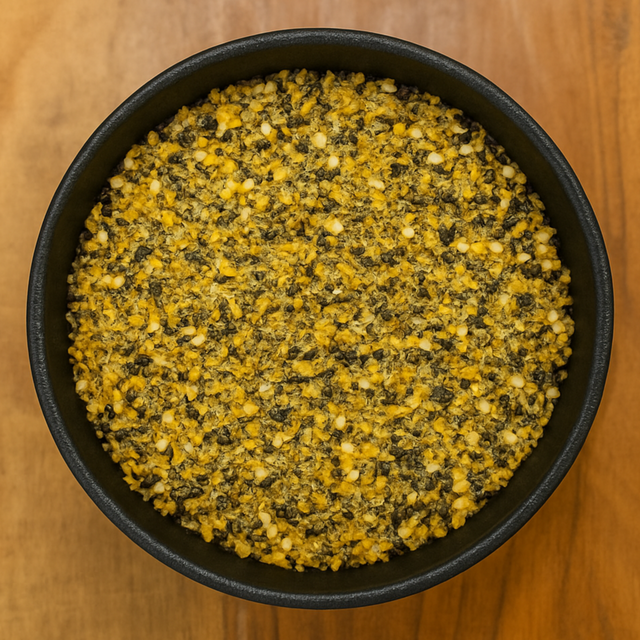 Nutrients: Carbohydrates (fiber from garlic, sesame seed, lemon peel, onion; maltodextrin from lemon powder), essential oils (e.g., allicin from garlic, limonene from lemon peel and extractives), flavonoids (from lemon peel, onion), vitamin C (from lemon peel, lemon extractives), sodium (from salt), calcium (from tricalcium phosphate), magnesium, potassium, iron, manganese, healthy fats (from sesame seed).