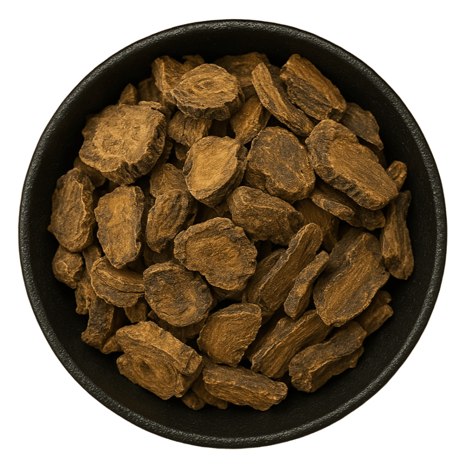 When decocted, Rhubarb Root & Rhizome produces a strong, bitter infusion with a fast-acting effect on the digestive system. It is often paired with herbs such as Mang Xiao (Mirabilite), Huang Lian (Coptis), or Tao Ren (Peach Seed) in classical formulas for heat-clearing and detoxification. For blood stasis, it may be combined with Mu Dan Pi (Moutan Bark) or Chi Shao (Red Peony Root).