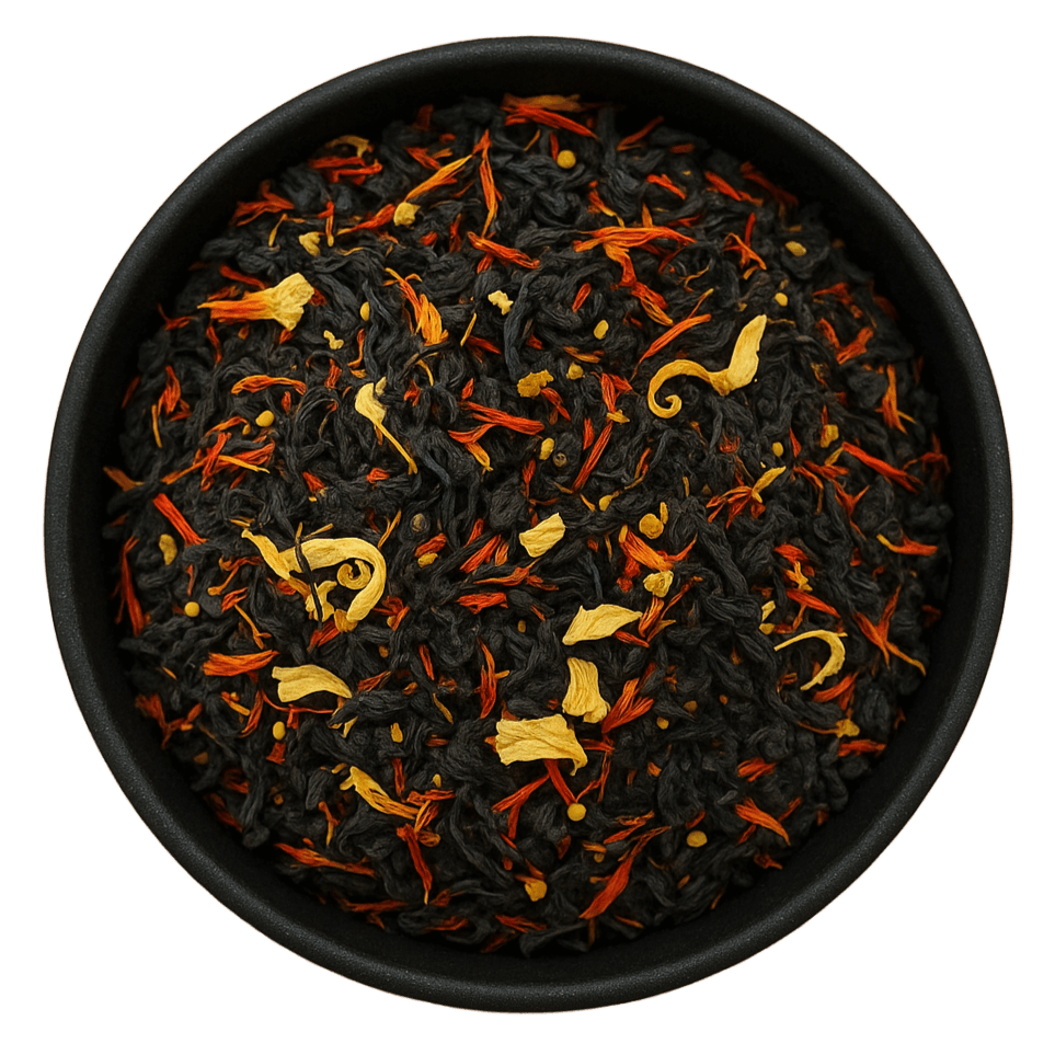 At the heart of this blend is Black OP (Orange Pekoe) Tea, a high-quality black tea known for its smooth, malty character and rich depth. The addition of natural and artificial peach, passionfruit, and tropical flavors creates a juicy, fruit-forward profile that pairs beautifully with the warm, full-bodied black tea base. Orange flowers and elder flowers contribute a light floral complexity, while safflower petals and bee pollen add an extra layer of natural sweetness and visual elegance.