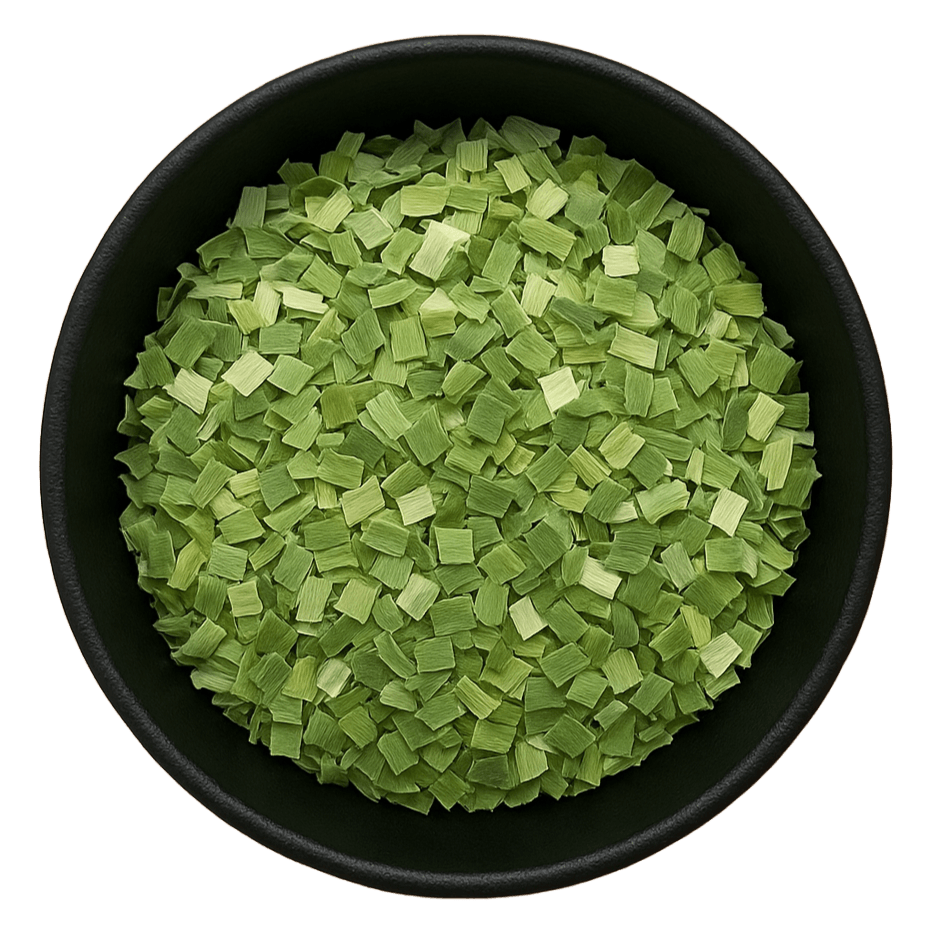 Notes: Green and white leek flakes (Allium ampeloprasum) are dehydrated leeks, providing sulfur compounds and antioxidants similar to other alliums, used for flavor in culinary dishes with mild cardiovascular benefits.