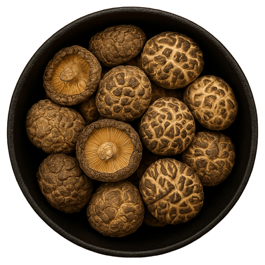 Notes: One of the most important culinary and medicinal mushrooms in East Asia. Known for its savory umami flavor and meaty texture, prized in soups, stir-fries, and braised dishes. In traditional medicine, believed to boost immunity, support circulation, and improve vitality. Dried shiitake develops a stronger aroma and should be rehydrated before cooking. Always cook before eating, as raw shiitake may cause skin irritation (shiitake dermatitis) in sensitive individuals.