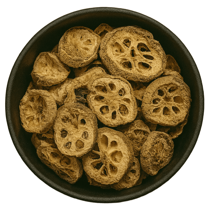 Lotus Root Node Piece (Nelumbo nucifera) is the dried section of the lotus root taken from the nodes, the joint-like parts where the rhizome segments connect. In traditional Chinese medicine (TCM), the lotus plant is considered sacred and medicinal from root to seed, with the nodes specifically prized for their hemostatic and cooling properties.