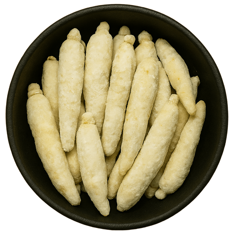 White Sugar Ginseng Whole (Panax ginseng C.A. Mey) is the dried, unprocessed root of cultivated ginseng, known for its tonifying, strengthening, and restorative properties in Traditional Chinese Medicine (TCM). Often called Bai Shen, this form of ginseng is steamed lightly or simply sun-dried to preserve its sweet, smooth, and balanced qi-tonifying nature, making it gentler than red ginseng while still deeply nourishing. White Sugar Ginseng is prized for its ability to tonify primal qi, strengthen the Spleen and Lung, calm the spirit, and support overall vitality, making it a classical restorative herb for fatigue, weakness, and recovery.