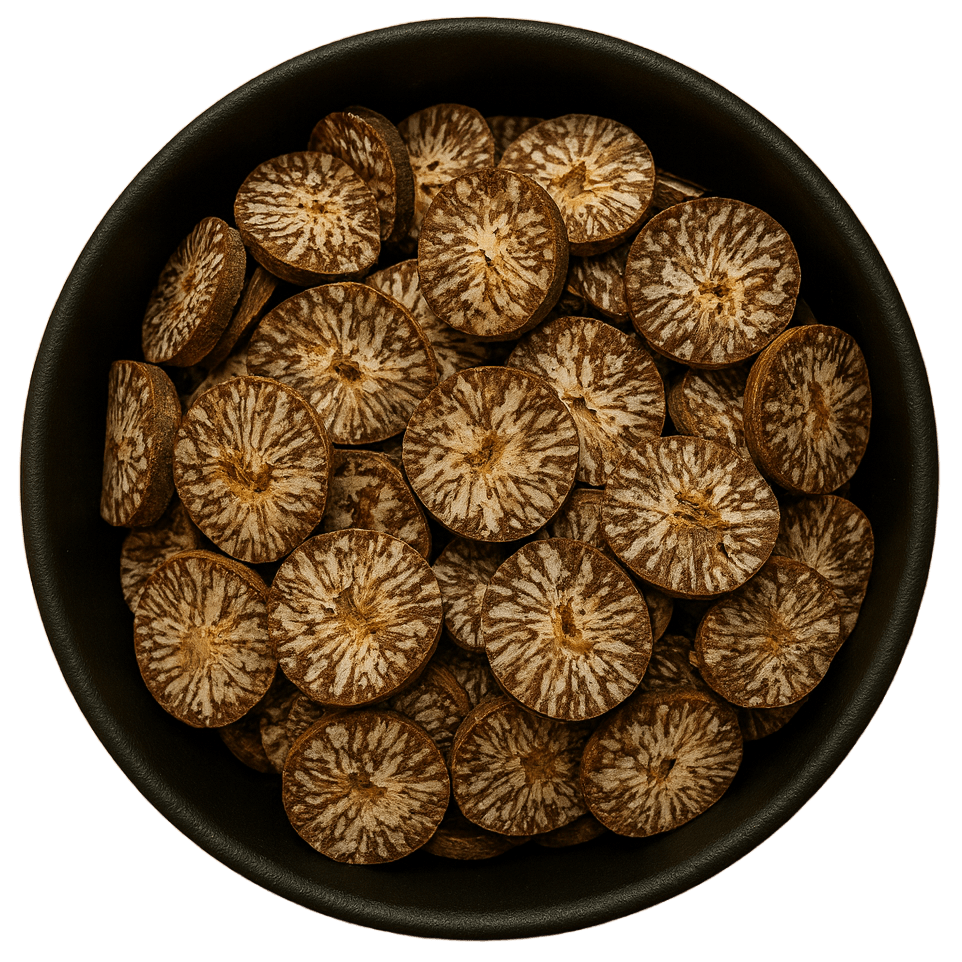 Betel Nut Slice (Areca catechu) is the dried, sliced seed of the Areca palm, a long-used traditional herb in Chinese, Ayurvedic, and Southeast Asian medicine known for its qi-moving, digestive-stimulating, and parasite-expelling properties. In Traditional Chinese Medicine (TCM), betel nut is called Bing Lang and is valued for its ability to promote the downward movement of qi, break up food stagnation, support intestinal motility, and expel parasitic accumulations. Its energetic nature is strong, warm, and dispersing, making it a powerful herb for abdominal fullness, digestive blockage, edema from dampness, and retention of undigested food.