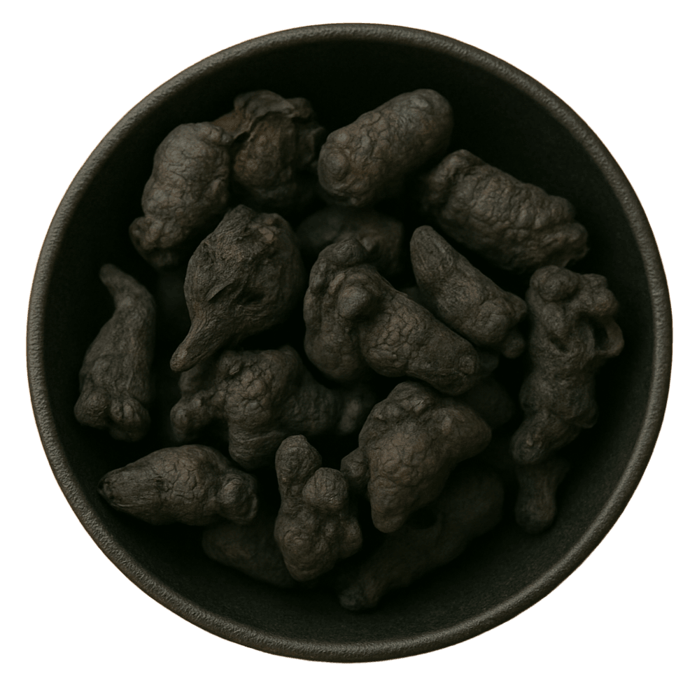 Black Panax Ginseng Root Whole (Panax notoginseng) is a deeply steamed and fermented version of the traditional Tian Qi (田七) or San Qi (三七) root, renowned for its enhanced potency, warming nature, and restorative effects. Through a traditional steaming process—similar to that used for red and black ginseng—the root undergoes transformation that deepens its color, concentrates its active compounds, and makes it especially suited for tonifying qi, nourishing the blood, and supporting vitality over the long term.